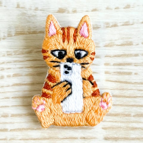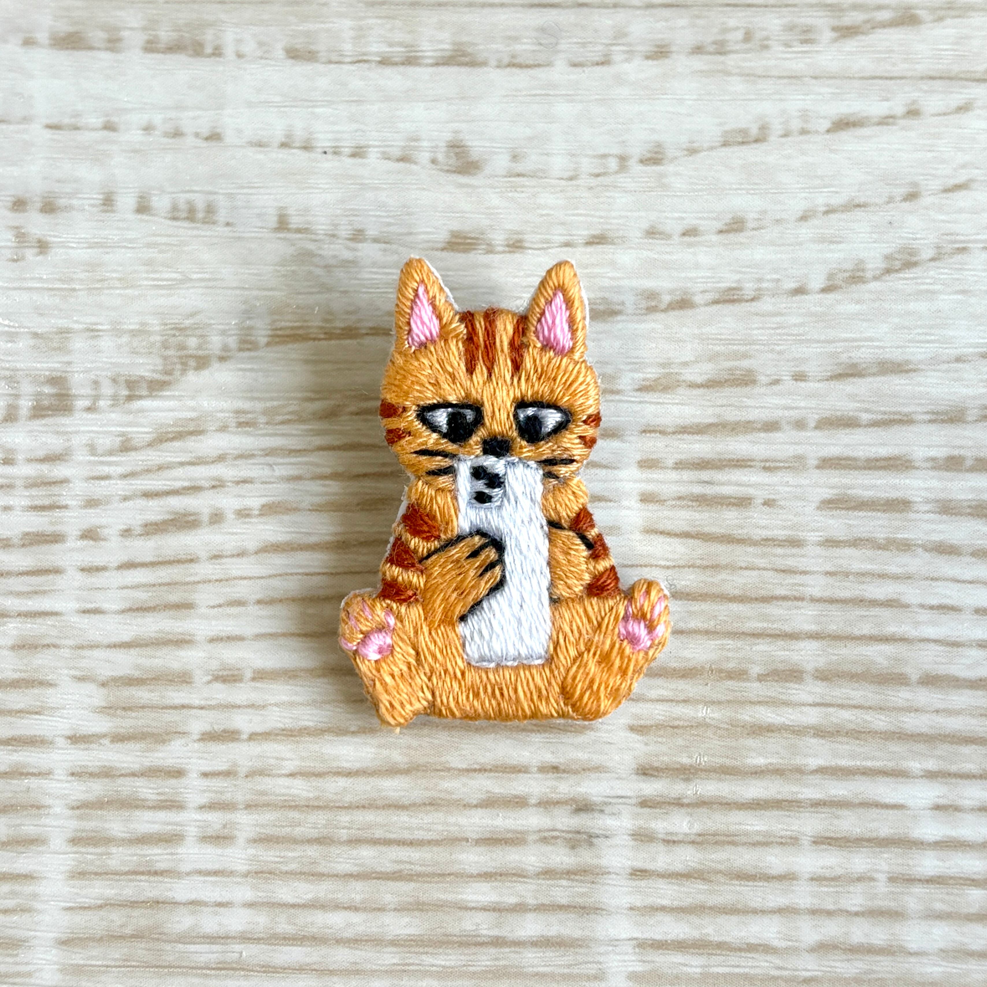 刺繍ブローチ【スマホに夢中な猫】1.5cmピン